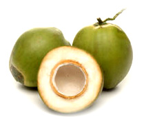 Picked and halved to show the young soft white Yoconut in the centre.