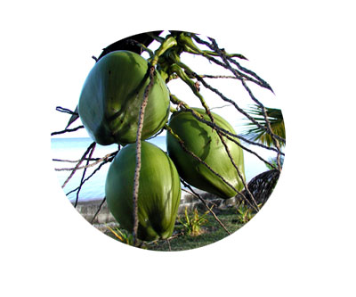 Young coconuts growing on a Coco palm, ready for picking.